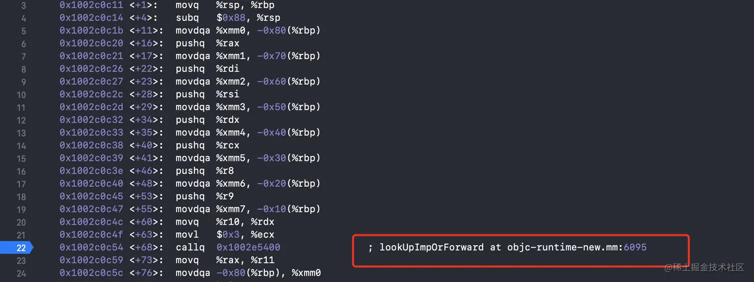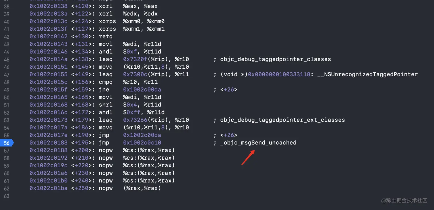 control + stepinto,进入objc_msgSend的汇编,找到_objc_msgSend_uncached,如图所示会进入C/C++方法实现中。