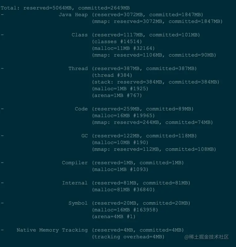 NMT是Native Memory Tracking的缩写,是Java7U40引入的HotSpot新特性,开启后可以通过jcmd命令来对JVM内存使用情况进行跟踪。注意,根据Java官方文档,开启NMT会有5%-10%的性能损耗。