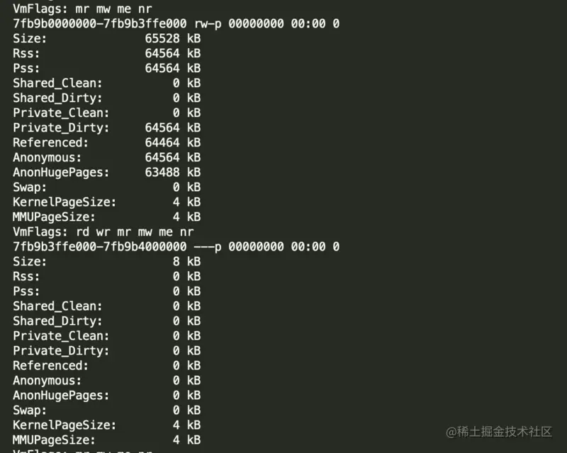 要执行gdb的dump需要先知道一个地址范围,通过smaps可以输出进程使用的内存块详细信息,包括地址范围和来源