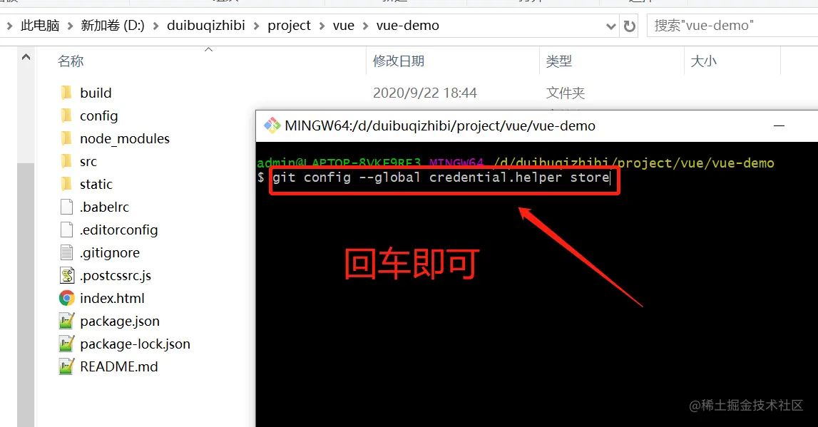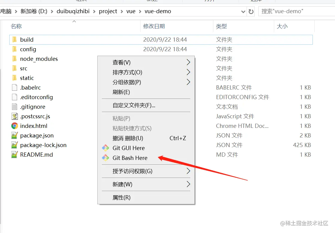 当然你也可以通过命令去完成这些操作,你可以直接在你当前项目目录下右键,出现一个git bash,点击弹窗一个命令窗,输入以下命令回车即可,如下图所示: