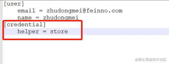 打开该文件,你会看到该文件里配置了账号和密码,在后面添加以下命令即可使git永久记住账号密码,记得编辑之后ctrl+s保存,如下图所示: