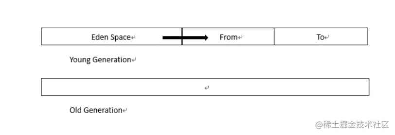 经过若干次YoungGC后,有些对象在From与To之间来回游荡,这时候From区与To区亮出了底线(阈值),这些家伙要是到现在还没挂掉,对不起,一起滚到(复制)老年代吧。