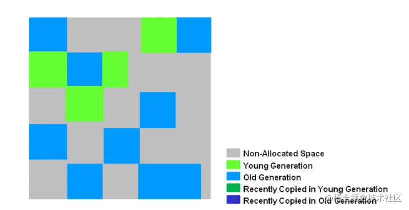 (6)复制/清除过程后。回收区域的活性对象已经被集中回收到深蓝色和深绿色区域。