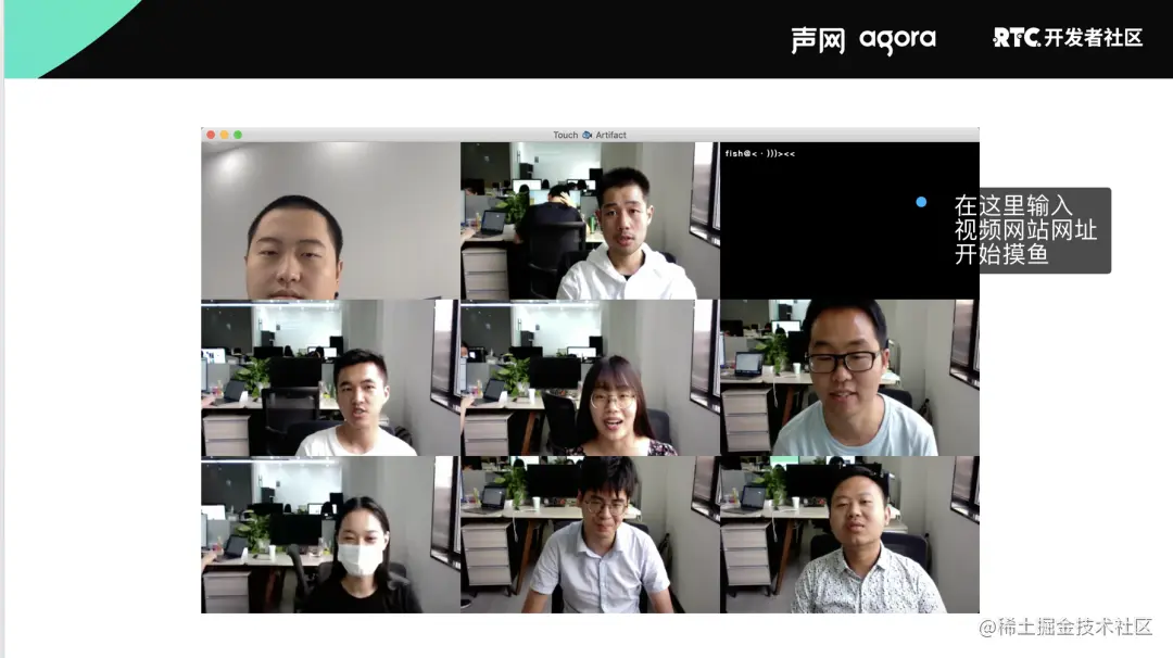 因为在这个九宫格显示的视频窗口里,除了你以外,其它的视频图像都是提前录好的。当你在这个状态下输入 B站或腾讯视频的网址后,你可以在右上角的视频窗口中浏览网页。(温馨提示,如果输入“Agora”,还会有彩蛋)