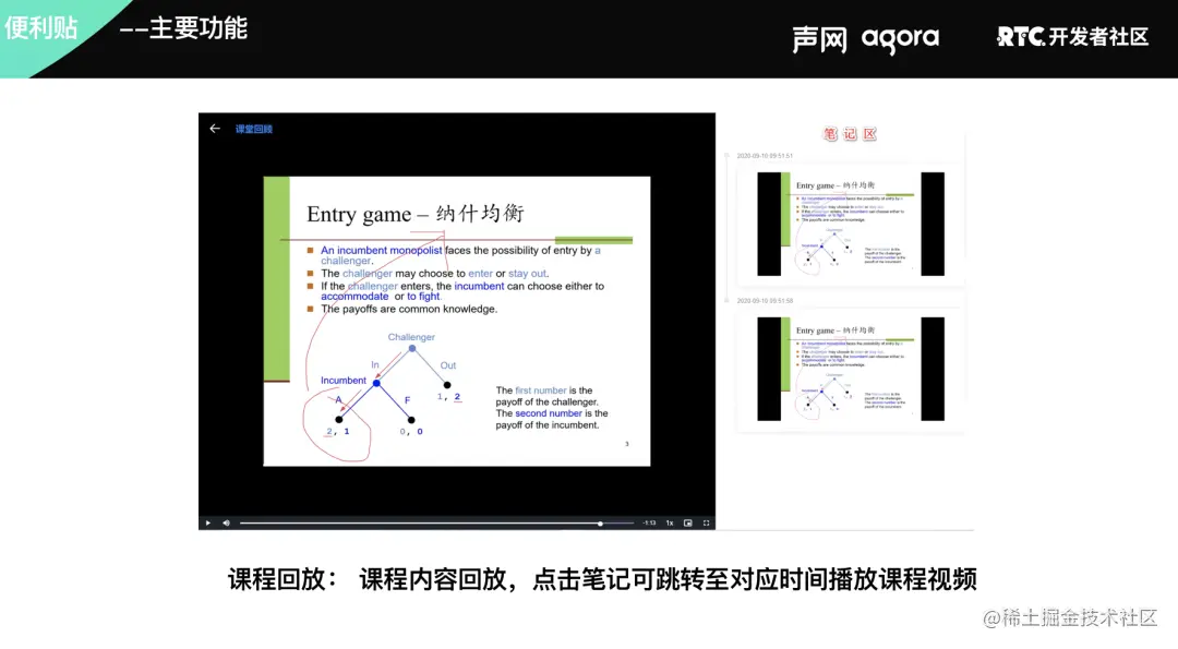 下课后,观看课程回放的时候,屏幕右侧会显示之前记下的笔记截图,点击截图,就会自动跳转到当时的课程画面。