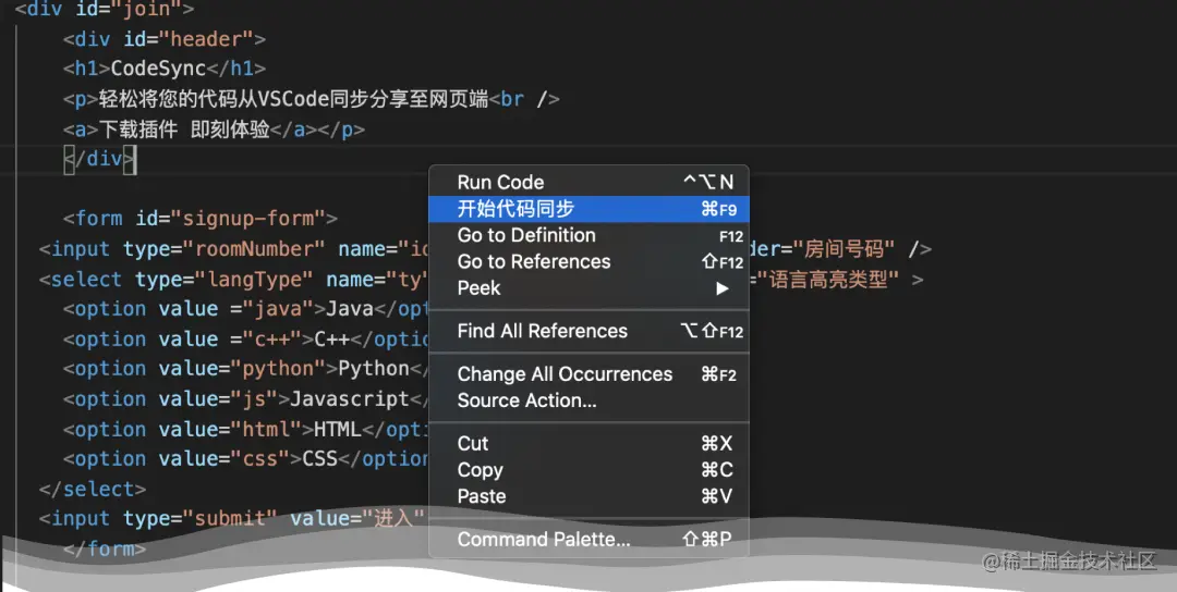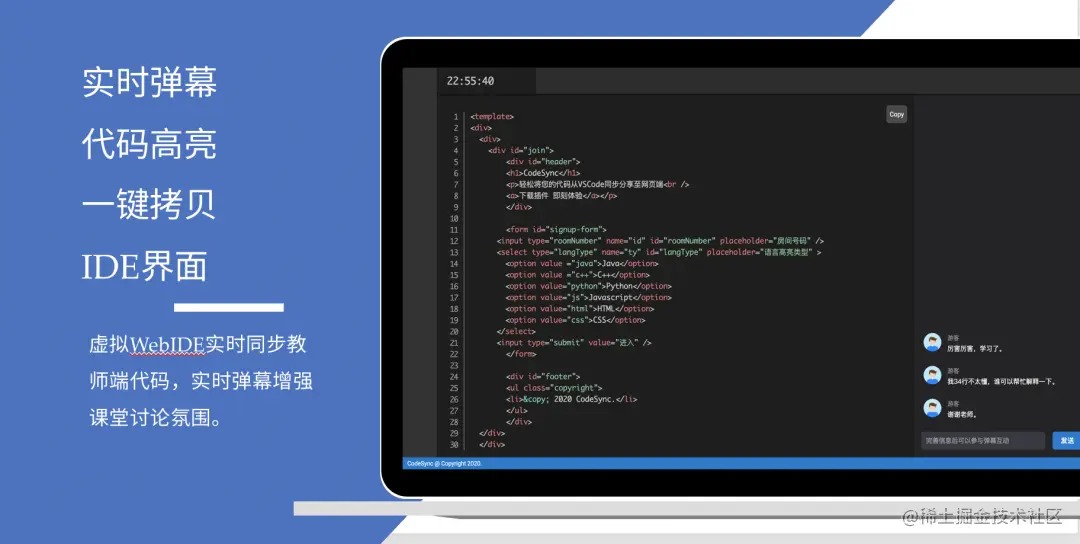 Codesync 是一个 VS Code 插件,单击右键菜单内的一个“开始代码同步”按钮,就可以利用声网Agora RTM SDK 的能力,实时将老师在 IDE 中修改的内容同步展示到 Web 浏览器端。同时,该插件会生成一个房间号和二维码,学生扫码或用房间号就可以加入房间,看到老师的操作。而且,学生在房间内还可以发送弹幕,实时交流。