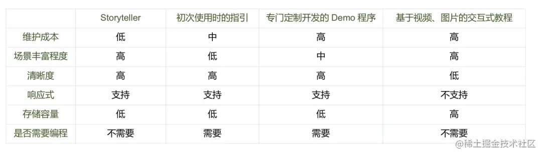 在传统的教学视频中,都会演示很多交互的步骤,比如完成某一步后点击哪个按钮,接着输入代码等。相对于其他演示 Demo 的方式的优缺点,参赛者也做了对比: