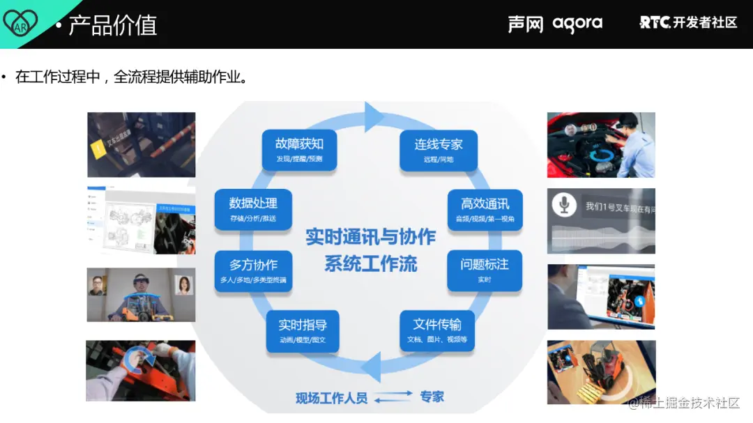 AR Assistance 主要是为了进行实时远程协作而开发的。例如,当一些硬件设备出现故障的时候,往往需要有工程师或专家亲自跑过去现场进行指导或技术支持。 而通过 AR + RTC,则可以进行远程的辅助作业。除了可以进行视频交流,还可以通过 AR 在视频中实时标注出问题所在。