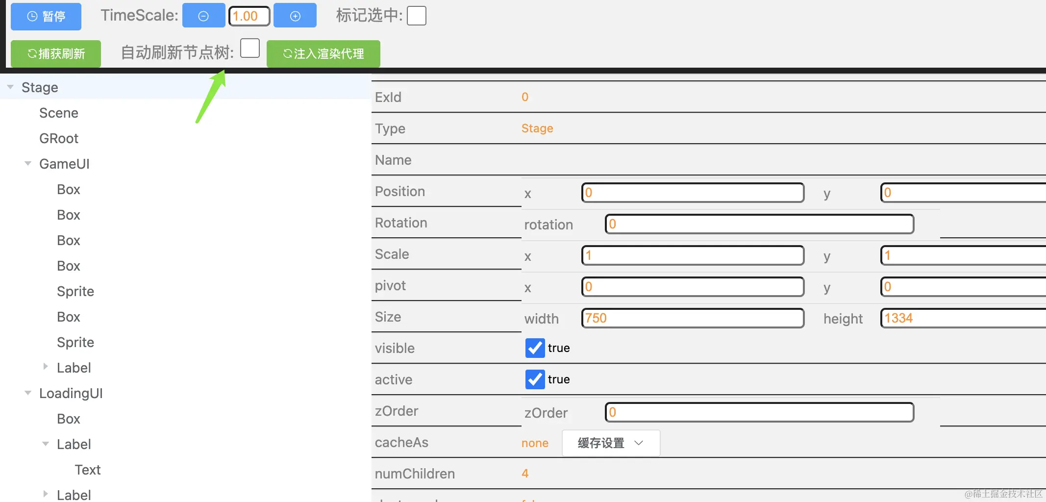 开启自动刷新节点树功能后,能够实时看到场景层级的变化,不需要手动捕获刷新,当场景层级非常多的时候会轻微影响到性能调试的准确性。如果在进行性能调优,请不要开启(默认关闭)。日常调试开发未有影响。