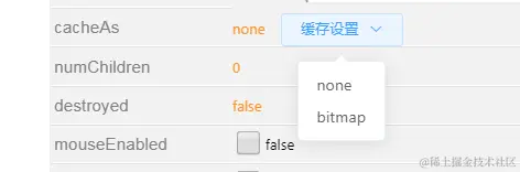 cacheAs为"none",不做任何缓存.当值为"bitmap"时,webgl模式下显示对象使用renderTarget缓存成静态图像可以大幅提升渲染效率.但是额外创建的renderTarget对象,会增加内存开销.通过该选项可以便捷的切换模式,找到优化方向.