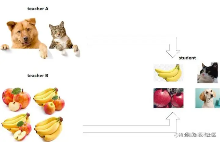用户使用狗和猫的数据集训练了一个teacher模型A,使用香蕉和苹果训练了一个teacher模型B,那么就可以用这两个模型同时蒸馏出一个可以识别狗,猫,香蕉以及苹果的模型,将两个不同与的数据集进行集成和迁移。