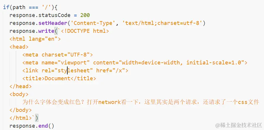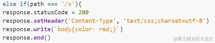 - 下图为nodejs中检测到路径/x后是如何设置响应头与响应体的(respone.write用于写响应体)