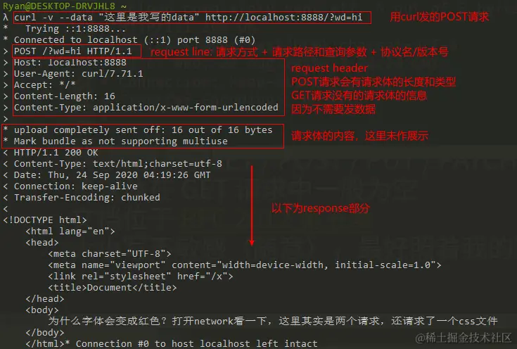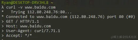 curl -v -H 'Ryan:OK' http://localhost:8888/?wd=hi //-H 为RequestHeader增加内容