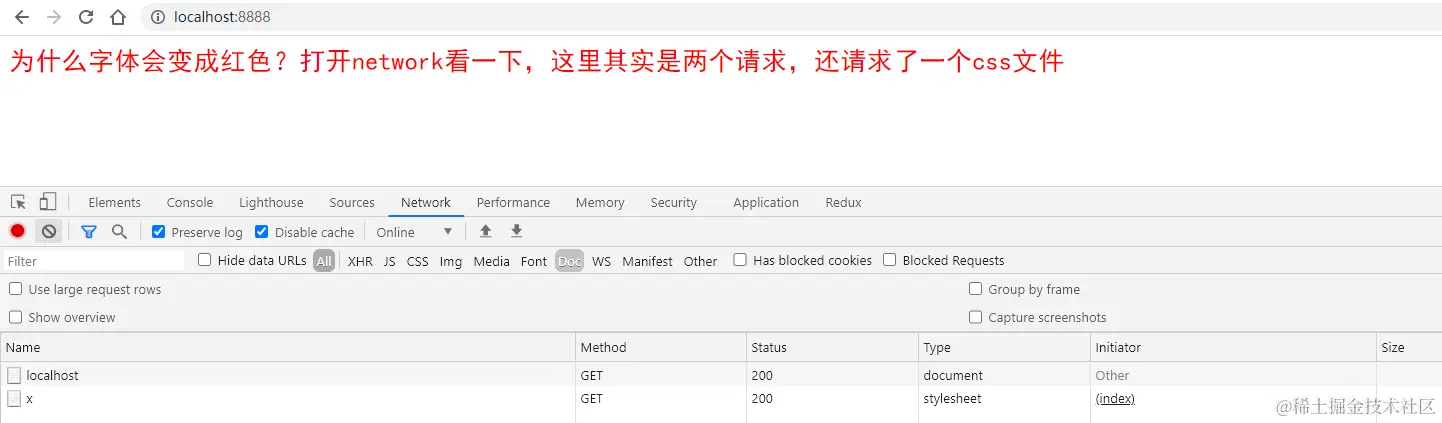 node server.js:8888 //要指明端口号- 打开浏览器输入地址,观察network