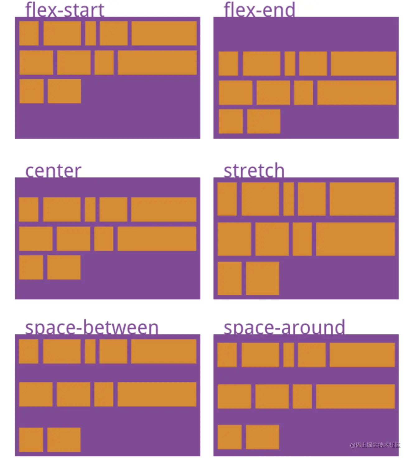 该属性是决定多行 flex items 在 cross axis 上的对齐方式,用法与 justify-content 类似。