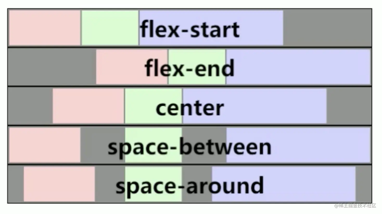 space-around:flex items之间的距离相等;flex items与main start、main end之间的距离是flex items之间距离的一半。(借鉴)