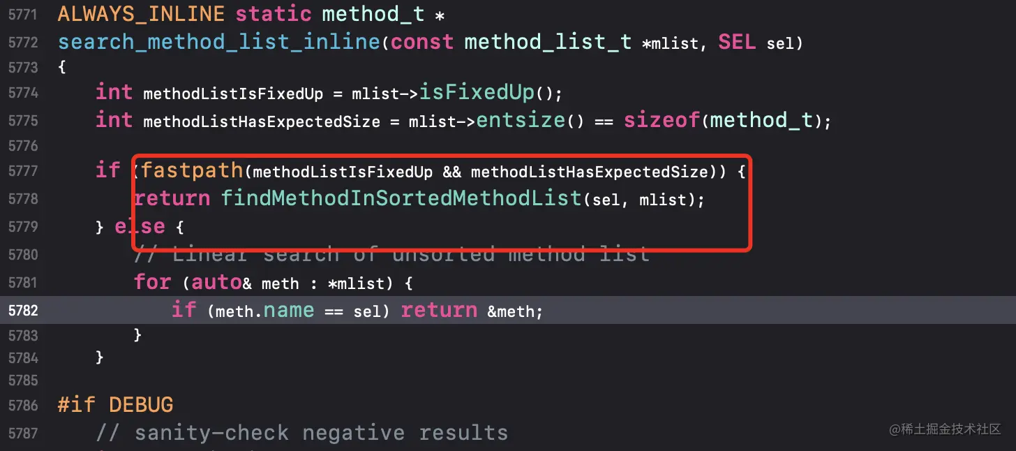 method_t *m = search_method_list_inline(*mlists, sel);