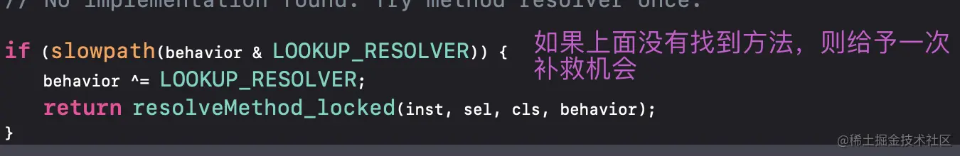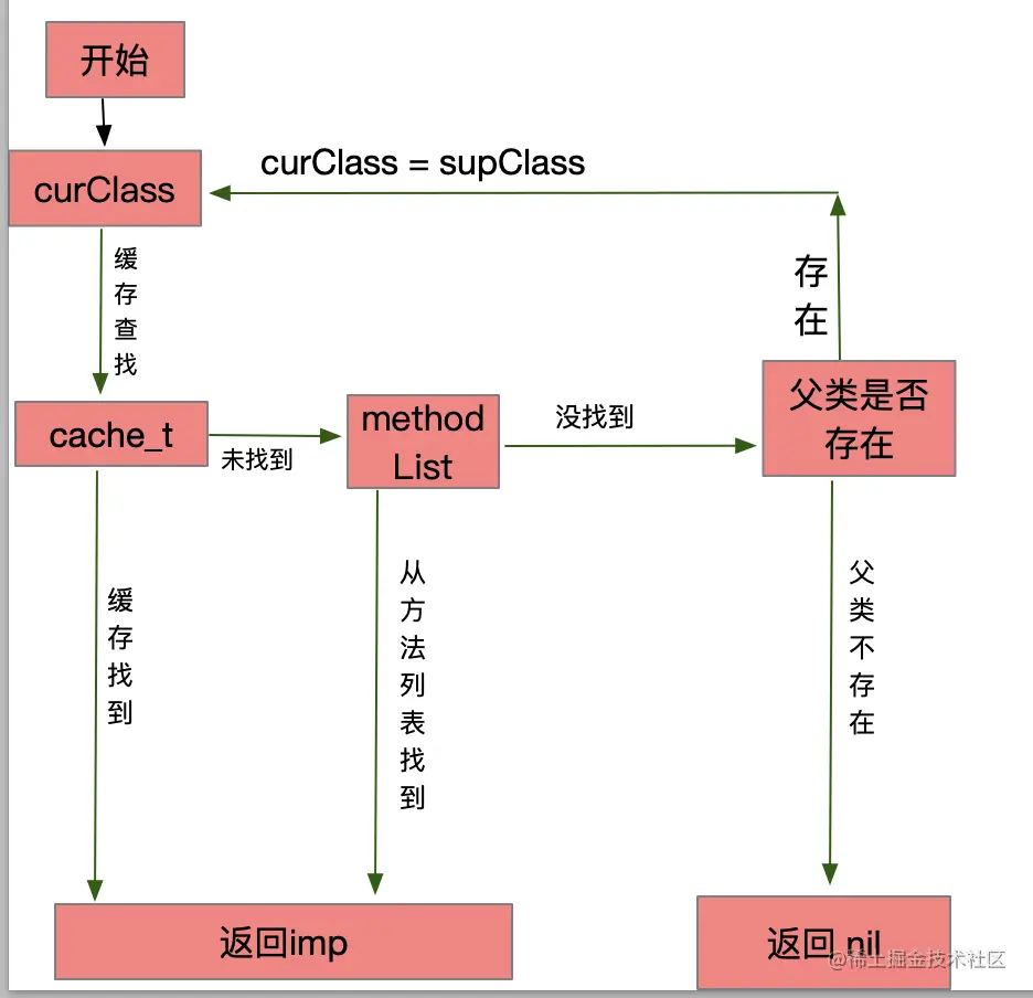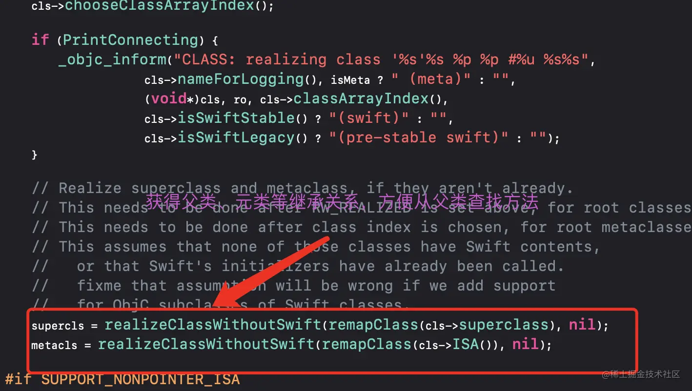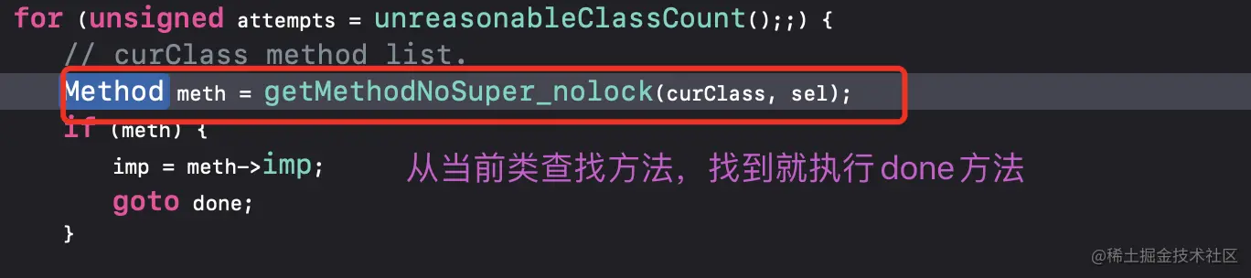 _objc_msgForward_impcache:从缓存中查找方法checkIsKnownClass:当前要查找的类是否是系统已知的,即是否是我们创建的,只有是系统已知的才能对方法、属性、协议等存储以及查找realizeClassMaybeSwiftAndLeaveLocked:该方法主要是获得当前对象继承关系,部分代码如下initializeAndLeaveLocked:主要是系统方法的自动调用,比如initalize或者reload等getMethodNoSuper_nolock:从当前类查找方法slowpath((curClass = curClass->superclass) == nil:从父类查找方法,并将父类赋值给curClassimp = cache_getImp(curClass, sel):从当前类(已经是父类了)的缓存中查找resolveMethod_locked:当前类、父类均没有找到则给予一次补救机会