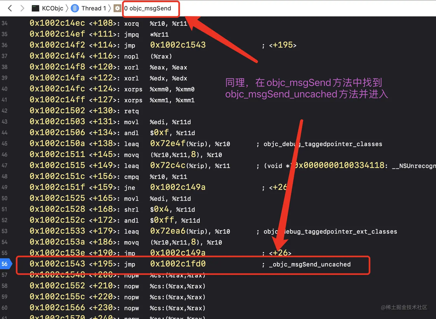 objc_msgSend方法中找到进入到objc_msgSend_uncached方法并进入在