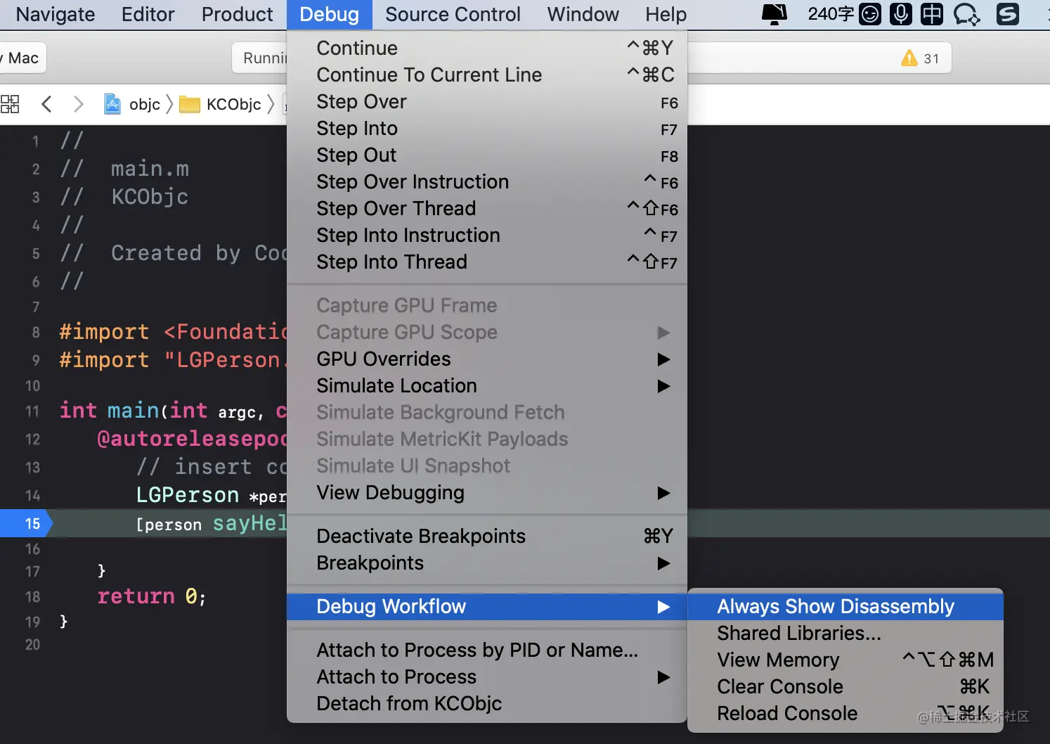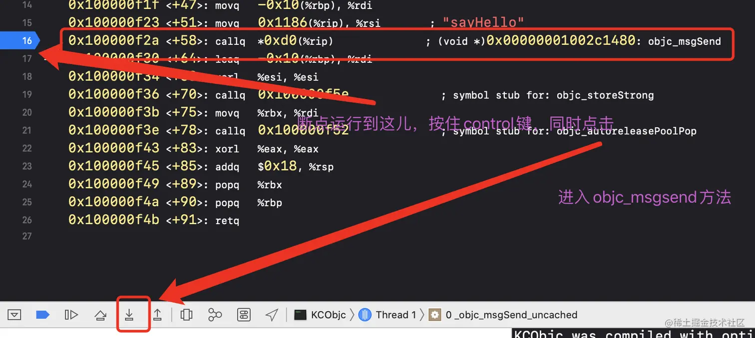 在 [person sayHello]处打上断点,运行代码,查看汇编我们找到