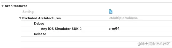 1、在Build settings 里搜索 EXCLUDED_ARCHS 在Debug下添加 Any iOS Simulator SDK 值为 arm64