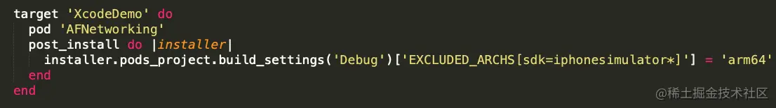 installer.pods_project.build_settings('Debug')['EXCLUDED_ARCHS[sdk=iphonesimulator*]'] = 'arm64'