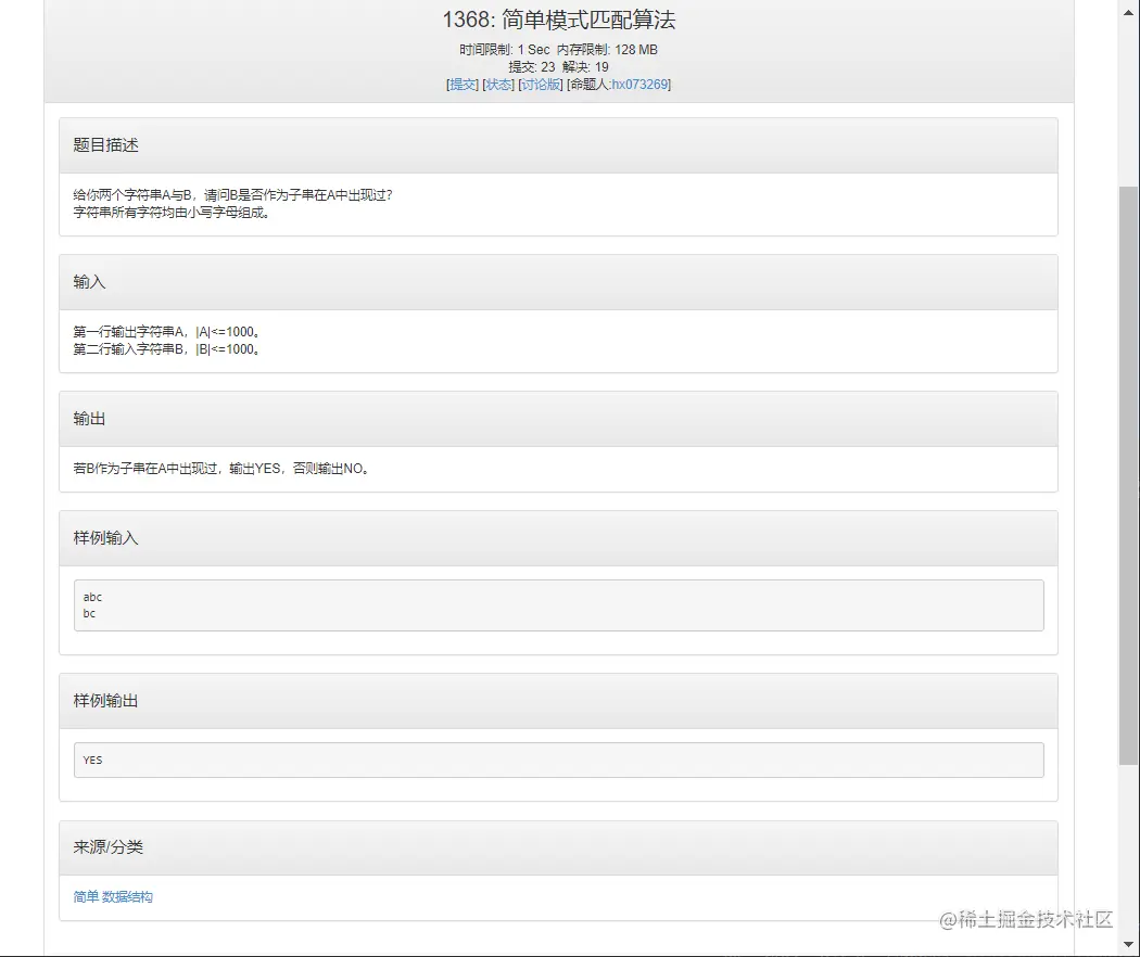 描述:给你两个字符串A与B,请问B是否作为子串在A中出现过?