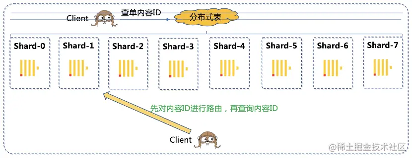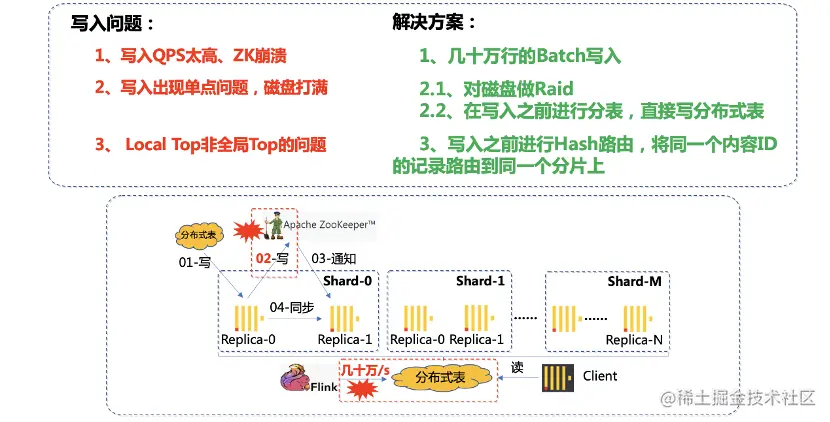 第三个问题是,虽然我们写入按照分片进行了划分,但是这里引入了一个分布式系统常见的问题,就是局部的 Top 并非全局 Top 的问题。比如同一个内容 ID 的数据落在了不同的分片上,计算全局 Top100 阅读的内容 ID,有一个内容 ID 在分片 1 上是 Top100,但是在其它分片上不是 Top100,导致汇总的时候,会丢失一部分数据,影响最终结果。我们做的优化是在写入之前加上一层路由,将同一个内容 ID 的记录,全部路由到同一个分片上,解决了该问题。