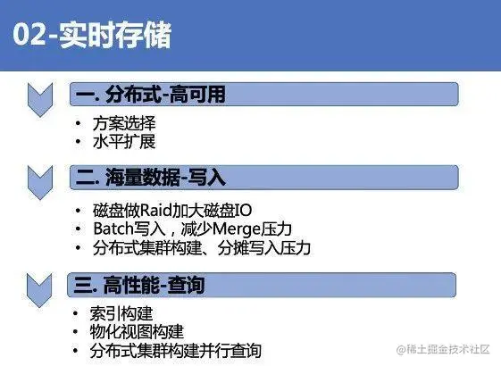 - 实时存储引擎如何支持高并发写入、高可用分布式和高性能索引查询,是比较难的。