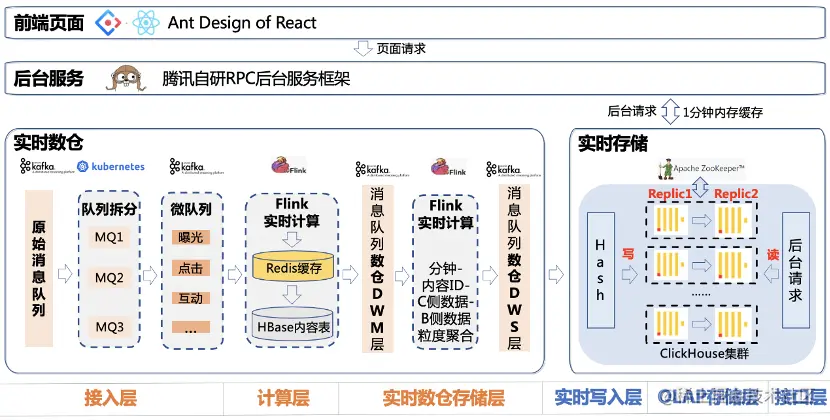 - 实时计算层主要负责,多行行为流水数据进行行转列,实时关联用户画像数据和内容维度数据;