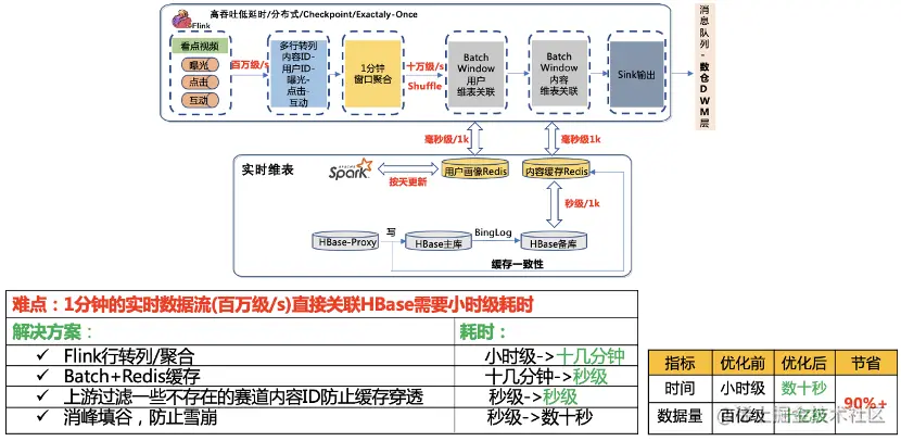 实时维表关联这一块难度在于。百万级/s的实时数据流,如果直接去关联 HBase,1 分钟的数据,关联完 HBase 耗时是小时级的,会导致数据延迟严重。