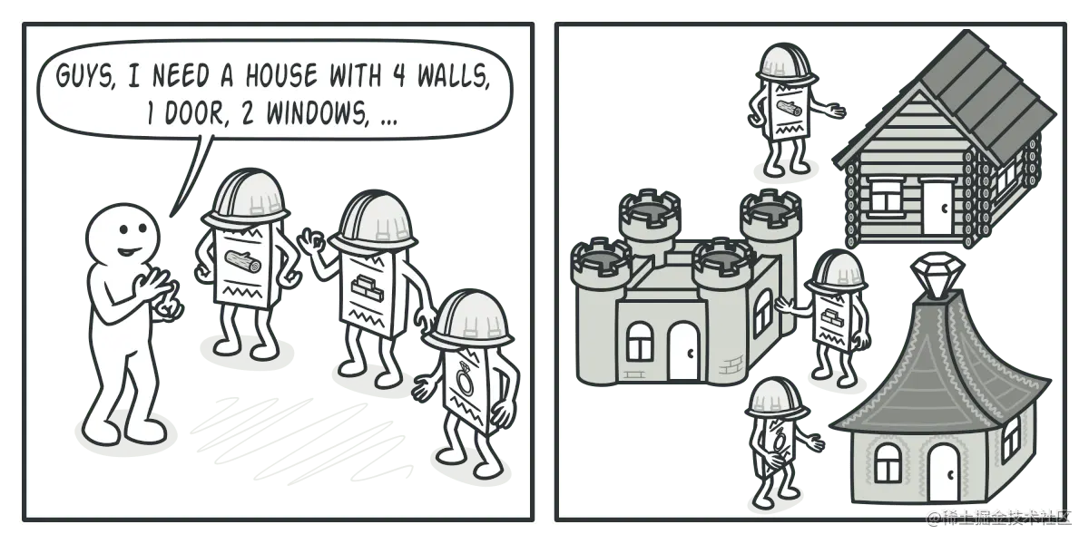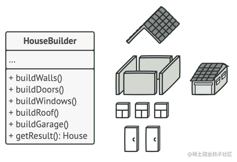 例如,假设有一个建造者用木头和玻璃建造所有东西,第二个建造者用石头和铁建造所有东西,而第三个使用黄金和钻石建造。通过执行相同的步骤,将从第一个建造者那里得到一栋普通房屋,从第二个建造者那里得到一座小城堡,从第三个建造者那里获得一座宫殿。但是,只有在调用构建步骤的客户端代码能够使用公共接口与建造者进行交互的情况下,这才起作用。