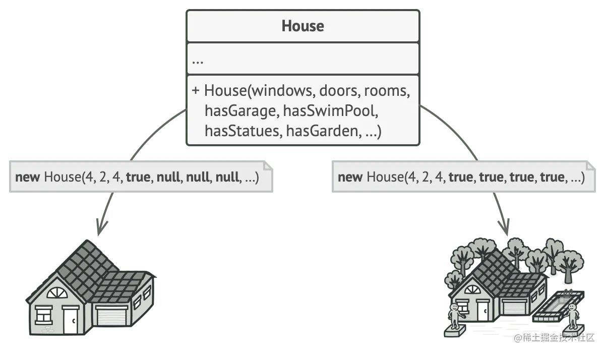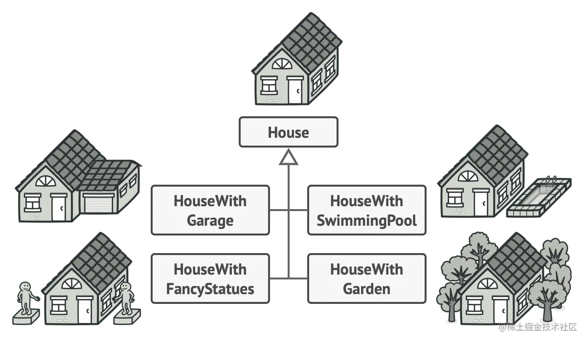 最简单的解决方案是扩展 House 基类并创建一系列子类以覆盖参数的所有组合。但是最终我们将获得大量子类。任何新参数(例如门廊样式)都将需要进一步扩展此层次结构。
