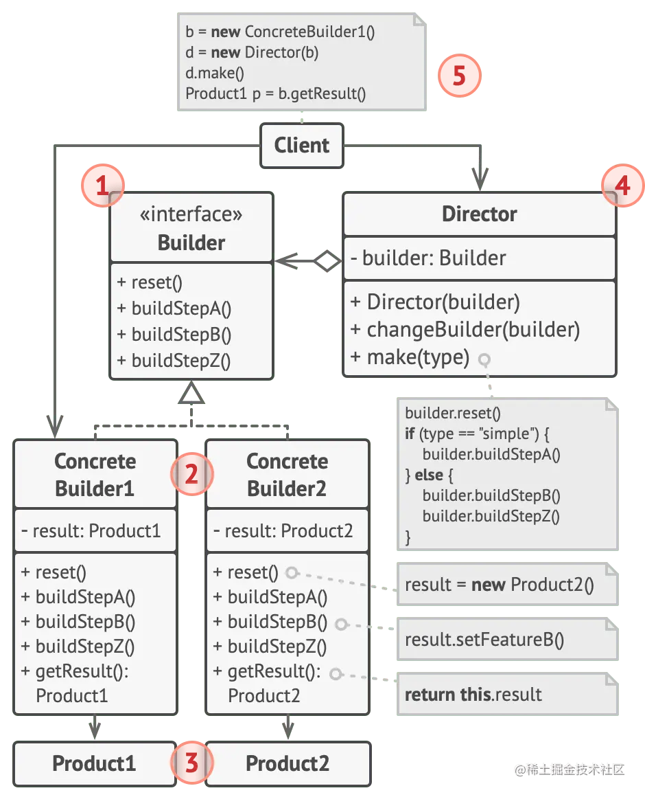 - 主管(Director) 类定义了调用构造步骤的顺序,这样就可以创建和产品的再利用特定配置的顺序。