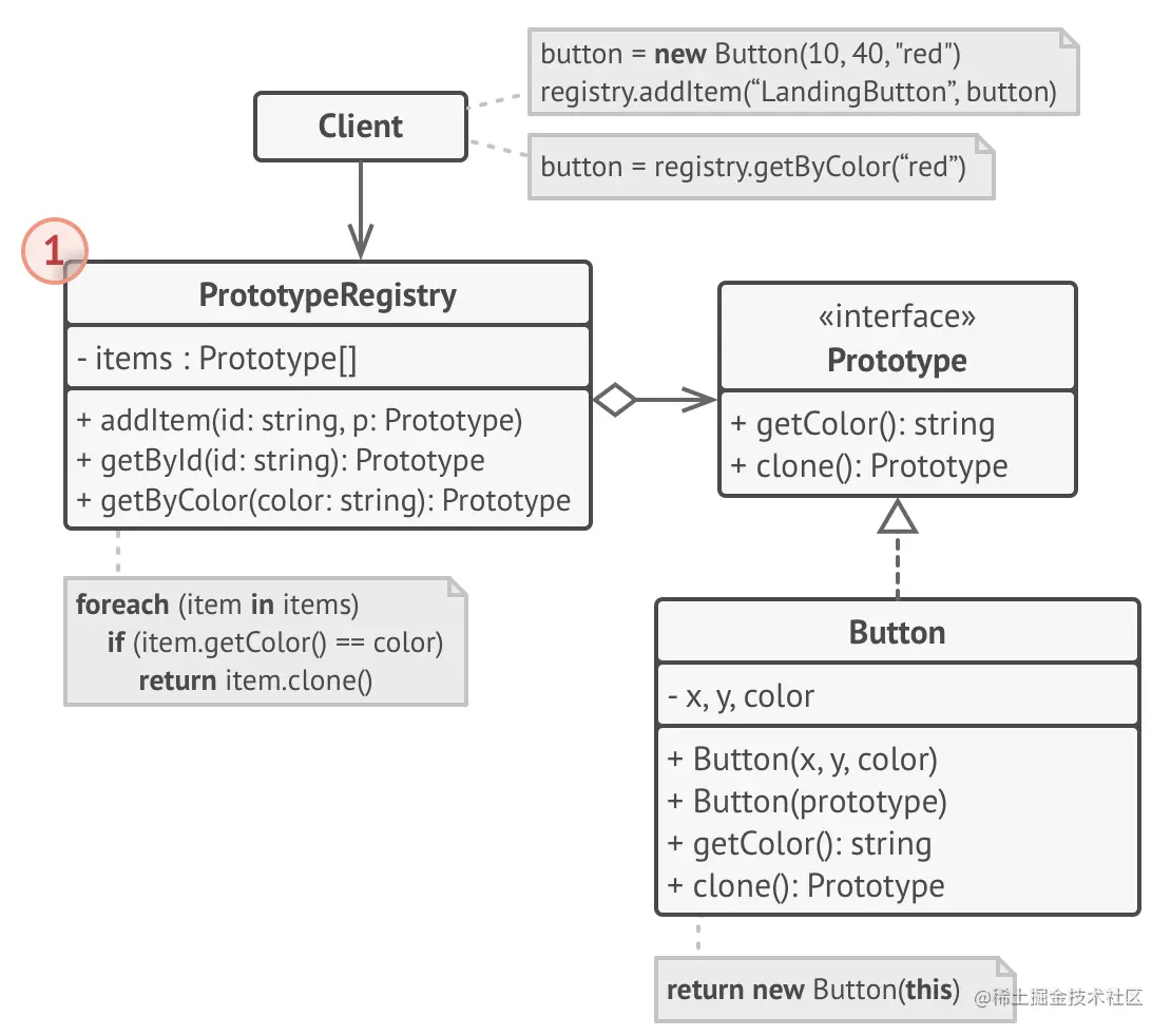 (可选)创建集中式原型注册表,以存储常用原型的目录。可以将注册表实现为新的工厂类,也可以使用静态方法将其放入基本原型类中以获取原型。此方法应基于客户端代码传递给该方法的搜索条件来搜索原型。条件可以是简单的字符串标签或复杂的搜索参数集。找到适当的原型后,注册表应将其克隆并将副本返回给客户端。