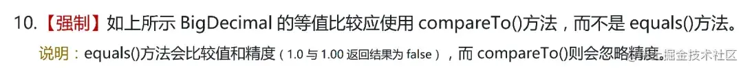 关于BigDecimal等值判断的这个知识点,在最新版的《阿里巴巴Java开发手册》中也有说明: