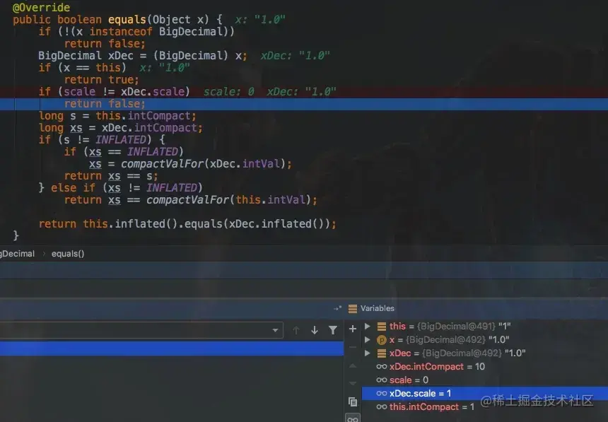 尝试着对代码进行debug,在debug的过程中我们也可以看到bigDecimal4的精度是0,而bigDecimal5的精度是1。
