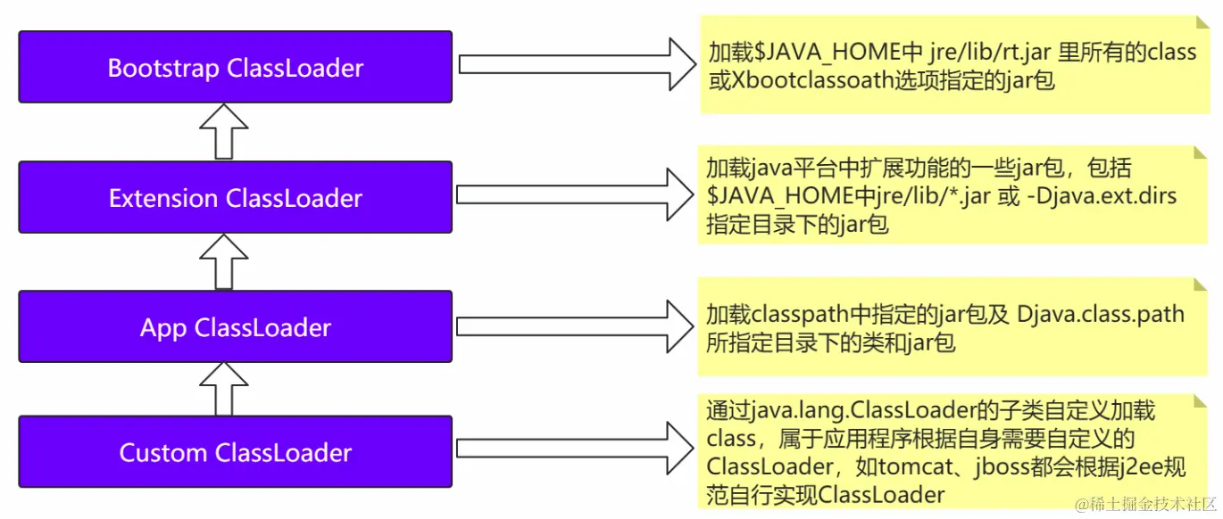 1)Bootstrap ClassLoader 负责加载$JAVA_HOME中 jre/lib/rt.jar 里所有的class或 Xbootclassoath选项指定