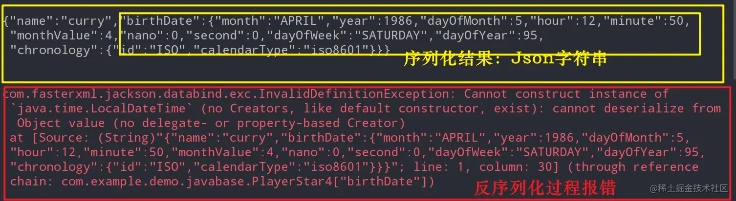 - 将player对象序列化为JSON字符串jsonString 的过程被正常执行了,但是LocalDateTime序列化之后的结果,是图中”黄框中的黄框“内容。