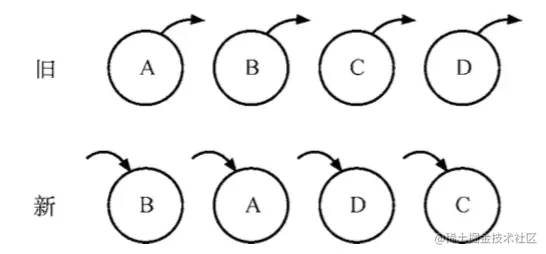如下图所示,旧集合中包含节点A、B、C 和 D,更新后的新集合中包含节点 B、A、D 和 C,此时新旧集合进行 diff 差异化对比,发现 B != A,则创建并插入 B 至新集合,删除旧集合 A; 以此类推,创建并插入 A、D 和 C,删除 B、C 和 D。
