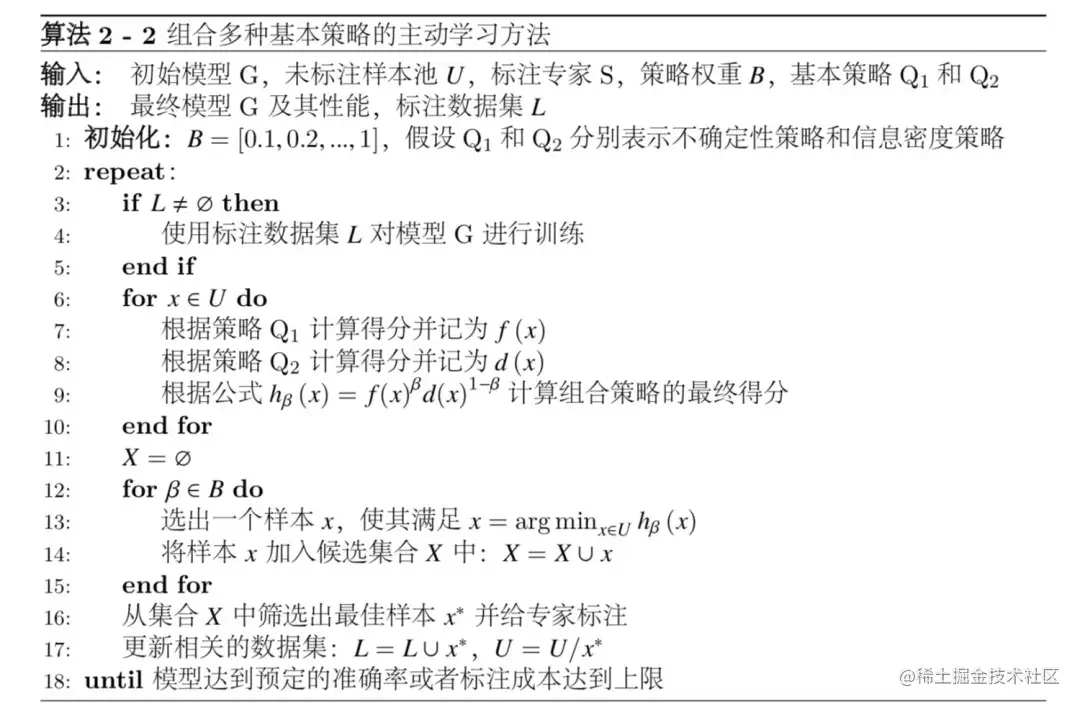 (1)组合多种基本策略的主动学习方法:组合策略将多个基本策略以互补的方式进行融合,广泛应用于图像分类任务中[36,37,38,83]。其中,Li 等[36]基于概率分类模型提出一种自适应的组合策略框架。Li 等[36]通过信息密度指标(Information Density Measure)将未标注样本的信息考虑在内,弥补了不确定性策略的不足。如算法 2-2所示,该算法能够自然地扩展到更多的组合策略。