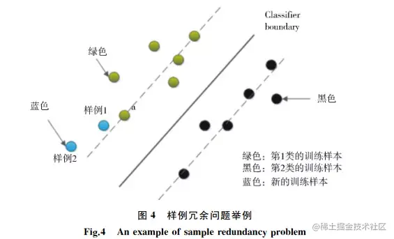 **训练集样本冗余:**如下图所示,蓝色圆圈所表示的新训练样本中,样例1与分类超平面的距离比样例2近,根据 BvSB 准则应当挑选样例1进行标注并补充到训练集中;但紧挨着样例1的绿色样例 a 已经在训练集中,此时若再加入样例1则对分类界面影响甚微。相比而言,将样例2补充到训练集中,对当前分类模型的训练贡献度更大。通过上述分析可知,主动学习中的样例选择度量主要分为2种:1)不确定性度量;2)差异性度量或代表性度量。样例的不确定性一般可通过计算其信息熵获得,样例的代表性通常可根据其是否在聚类中心判断,而样例的差异性则可通过计算余弦相似度(基于采样策略的主动学习算法研究进展,2012)或用高斯核函数(基于多特征融合的中文评论情感分类算法,2015)获得。