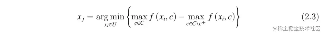 (2)不确定性策略(Uncertainty Strategy,US): US 假设最靠近分类超平面的样本相对分类器具有较丰富的信息量,根据当前模型对样本的预测值筛选出最不确定的样本。US 包含了一些基础的衡量指标:1)最不确定指标(Least Confidence,LC)将预测概率的最大值的相反数作为样本的不确定性分数。2)边缘采样(Margin Sampling,MS)认为距离分类超平面越近的样本具有越高的不确定性,常与 SVM 结合并用于解决二分类任务,但在多分类任务上的表现不佳。3)多类别不确定采样(Multi-Class Level Uncertainty,MCLU)是 MS 在多分类问题上的扩展,MCLU 选择离分类界面最远的两个样本,并将它们的距离差值作为评判标准。MCLU 能够在混合类别区域中筛选出最不确信度的样本,如式(2.3)所示。其中,xj 表示被选中的样本,C 表示样本 xi 所属的类别集合,c+ 表示最大预测概率对应的类别,f (xi, c) 表示样本 xi 到分类超平面的距离。4)熵值最大化(Maximize Entropy,ME)优先筛选具有更大熵值的样本,熵值可以通过计算得到,其中 pi 表示第 i 个类别的预测值。5)样本最优次优类别(Best vs Second Best, BvSB)[79]主要是针对多分类问题的一种衡量指标,并且能够缓解 ME 在多分类问题上效果不佳的情况。BvSB 只考虑样本预测值最大的两个类别,忽略了其他预测类别的影响,从而在多分类问题上的效果更佳。