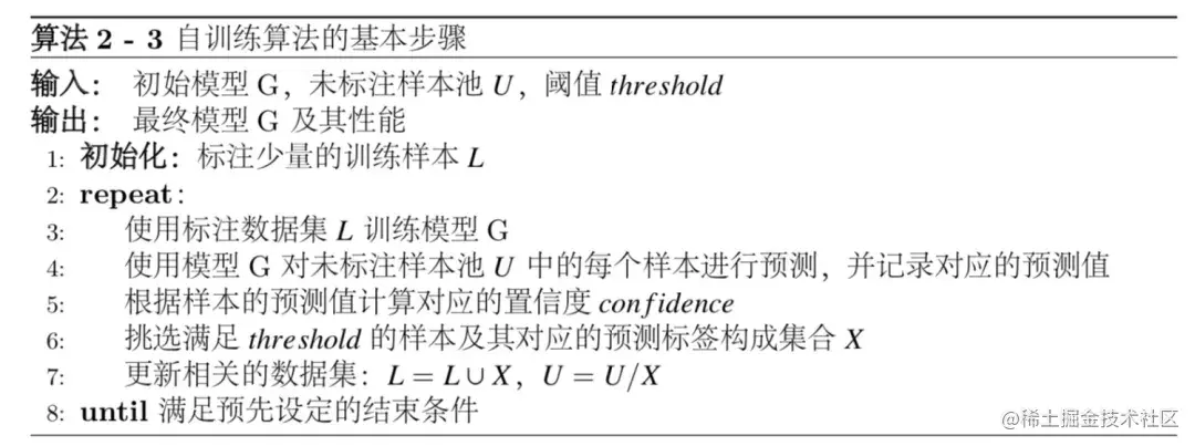 (2)结合半监督学习(Semi-Supervised Learning)的主动学习方法:自训练(Self-training)算法作为半监督学习的一种基础方法,其核心步骤如算法2-3所示。由于自训练算法在训练过程中会根据模型的预测信息,挑选合适的样本及其对应的预测标签加入训练集,而且初始化少量的标注样本能够保证模型的初始性能,因此初始化训练环节对其后续的学习过程至关重要。半监督学习算法需要解决的挑战之一是:在训练的过程中容易引入大量的噪声样本,导致模型学习不到正确的信息。部分研究员们通过构建多个分类器的协同训练算法缓解噪声样本,如Co-Training[84] 和 Tri-Training[85]。