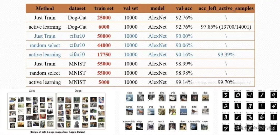 本文分享的实践部分,按照算法2-1分别对MNIST、Cifar-10和Dog-Cat三个数据集进行实验(分类模型使用了AlexNet,深度学习框架使用了PyTorch)。如下表所示,在MNIST数据集的实验中(train_num=55000, val_num = 10000):1)使用全部5.5万的训练数据直接训练模型,在1万个验证集得到的准确率为98.99%;2)使用主动学习的不确定性策略(Uncertainty Strategy),只需要5000张标注样本,在相同的1万个验证集得到的准确率就达到99.14%。此外,将训练好的模型对剩余的50000(55000-5000)张样本进行预测,得到99.70% 的效果。由此可见,仅仅使用不确定性策略在MNIST数据集上,就能够显著地减少大量的标注成本。