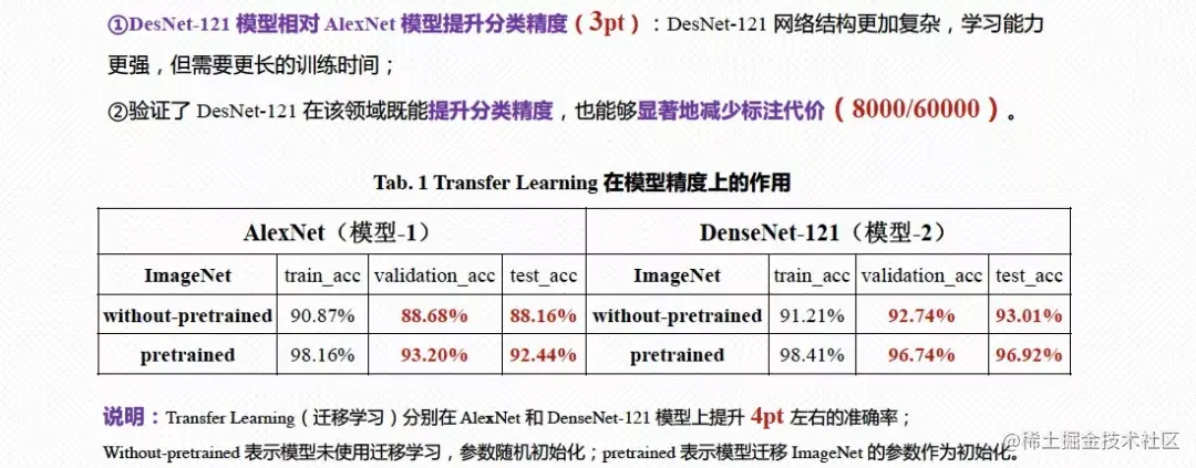 此外,我们尝试了更加复杂的模型(DesNet121),提高模型学习能力的同时,也带来了更多训练时长的弊端。但总体的分类精度提升了3pt。同时,我们也分别在AlexNet和DenseNet121等模型上验证了模型预训练带来的效率。