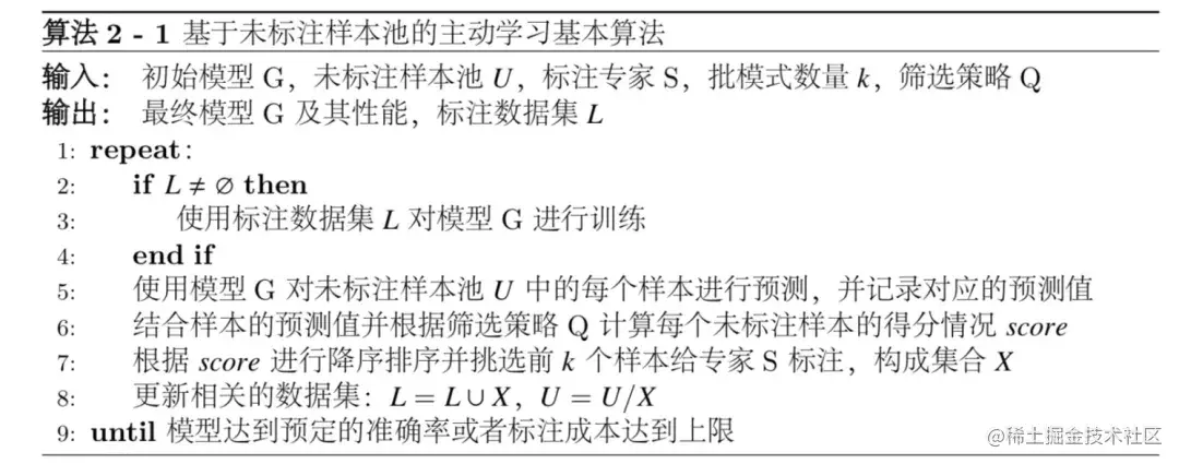 如算法2-1所示给出了“基于为标注样本池的主动学习方法”,本文也在第一部分详细地介绍了主动学习的基本流程,此处不再赘述。