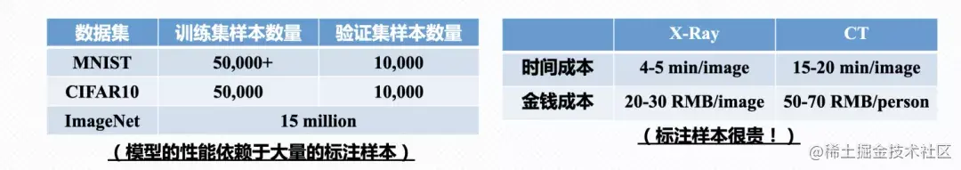 在大数据和算力的助力下,深度学习掀起了一波浪潮,在许多领域取得了显著的成绩。以监督学习为主的深度学习方法,往往期望能够拥有大量的标注样本进行训练,模型能够学到更多有价值的知识(如下左图展示了3组常见的图像分类数据集,拥有上万的标注样本)。然而,实际应用场景的标注样本严重稀缺。并且,标注大量样本将产生昂贵的标注成本(如下右图所示,标注一张X射线图需要5分钟和30元左右的成本,一张CT图需要20分钟和70元的成本)。