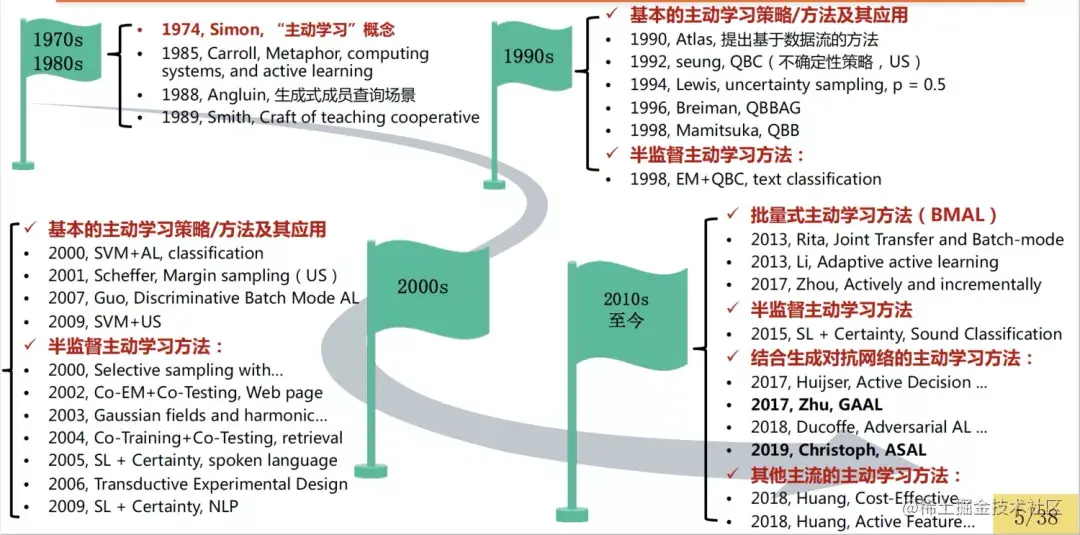 本节将围绕如下要点对主动学习方法的研究现状展开讨论,包括:1)基于未标注样本池的主动学习策略;2)批量式主动学习方法,侧重于组合式策略以及引入聚类算法的主动学习方法;3)半监督主动学习方法;4)结合生成对抗网络的主动学习方法。此外,主动学习方法在近几年的进展不仅局限于上述归类的方法,本节将其总结在“其他主流的主动学习方法”(本文涉及的参考文献,都可以通过文末的参考文献提供的链接中获取)。
