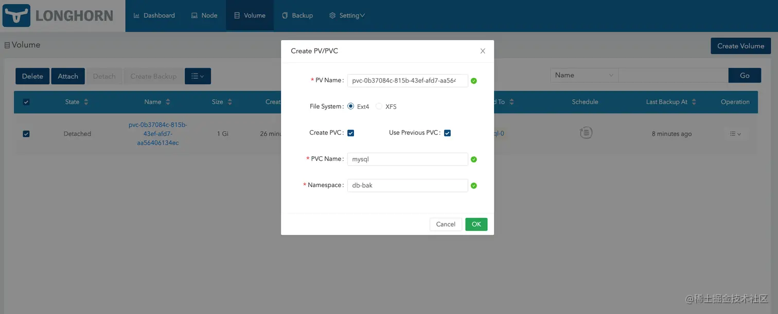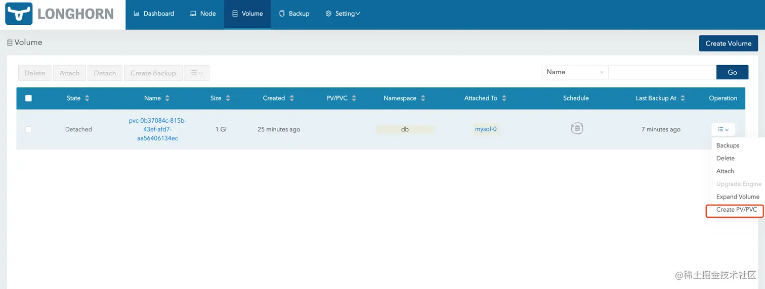 等待卷状态变成Detached以后,选择创建PV/PVC。